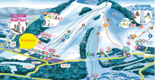 こちらはアップかんなべのゲレンデ地図なのですが、その地図におさまるほど「フェアフィールド・バイ・マリオット・兵庫神鍋高原」は近距離にあります。一番近い中央ゲレンデまでは徒歩5分。