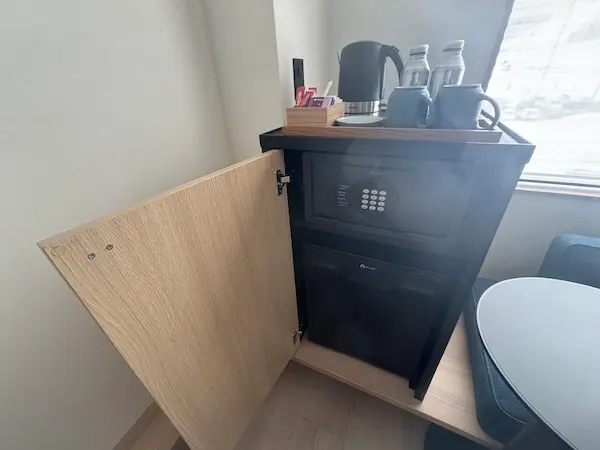 奥にはセーフティボックスと冷蔵庫がありました。その上には紅茶とミネラルウォーター。